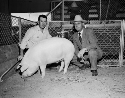Swift & Company bought for $425 the grand champion barrow of the Southwestern Exposition and Fat Stock Show. Jack Lowe, head hog buyer for Swift, is at right. Other man is Harvey Richardson of Elmore City, owner of the champion. Published in Fort Worth Star-Telegram morning edition February 2, 1952.