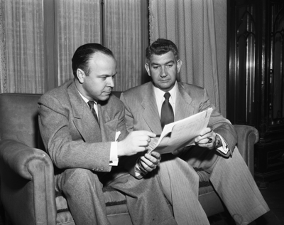 Wayne Ferrell, left, assistant to the vice president of the Hilton Hotel Corporation at San Diego, and Arthur Griffith, general manager of The Hilton (formerly Blackstone) in Fort Worth, plan a survey to determine improvements needed in the newly acquired hotel.