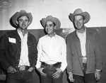 Rodeo cowboys. Gene Pruett (far right), saddle bronc riding. Pruett is shown with 2 unidentified men.