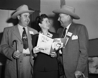 Ted Dunham, left, Mrs. Dunham and L. W. Collins are shown as they prepared to do some sightseeing in Fort Worth. They were among the big Baton Rouge delegation here for the Stock Show. Published in Fort Worth Star-Telegram evening edition February 2, 1952.