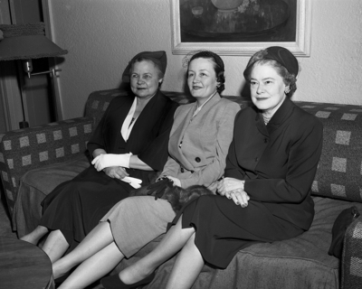 These Baton Rouge women were among the big Louisiana delegation in Fort Worth for the Southwestern Exposition and Fat Stock Show. They are, left to right, Mrs. Glenn A. Laidlaw, Mrs. H. B. Parker and Mrs. L. W. Collins. Published in Fort Worth Star-Telegram evening edition February 2, 1952.