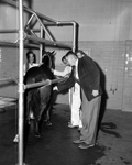 A quarter horse filly from the T. E. Mercer Ranch near Fort Worth is examined by Dr. W. C. Banks of the Texas A&M veterinary school faculty in the treatment room of the new hospital.