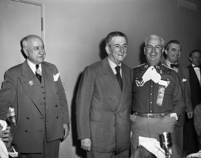 Edward Everett Horton, left, starring here in "The Merry Widow", is shown with the chairman of the Louisiana delegation, Glenn Laidlaw. Published in Fort Worth Star-Telegram morning edition February 3, 1952.