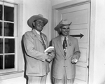 Gay Copeland of Sonora, left, president of the National Cutting Horse Association, presented a silver belt buckle to Douglas Mitchell of Fort Worth, retiring secretary of the group since 1918. Mitchell's successor is L. P. Bloodworth of Sonora. Published in Fort Worth Star-Telegram morning edition February 3, 1952.