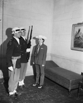 Miss Lora Virginia Soderlund, sweetheart from Wichita Falls, inspects two members of the Sam Houston Rifles, Reserve Officers' Training Corps unit at Texas Tech. Left to right are Lieutenant Kenneth E. Owen of Lubbock, Master Sergeant Ronald Tullis of Anton and Miss Soderlund. The Tech unit gave a drill exhibition and Fat Stock Show. Published in Fort Worth Star-Telegram morning edition February 3, 1952.