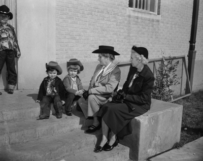 Four Baird residents, rested on the steps of Will Rogers Memorial Coliseum before attending the matinee rodeo performance. Left to right are Elaine Henry, 2; Barbara Henry, 4; Mrs. Everett Hughes and Mrs. W. L. Henry, grandmother of the children. Published in Fort Worth Star-Telegram morning edition February 3, 1952.