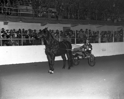 Leader of the Band, owned by Boedeker Farms of Dallas, and driven by Wallis Roberts, won the $600 Roadster Stake at the Southwestern Exposition and Fat Stock Show. Published in Fort Worth Star-Telegram morning edition February 4, 1952.