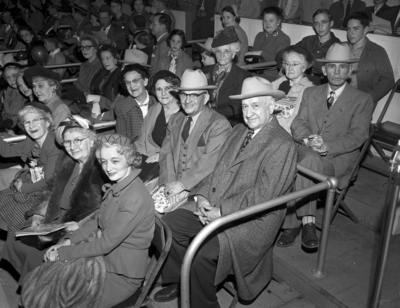Bowie visitors here for the rodeo. Seated in the front row from left to right is: Mrs. Tan Turner, Mrs. Emma Green, and Minnie Meacham Smith Carter. In the second row from left to right is: Mrs. Minnie Hutchinson, Mrs. Henry Turner, Tan Turner, and Amon Carter. In the third row, from left to right is: Doctor Jesse Givens, Mrs. George Slaughter, and Henry Turner.