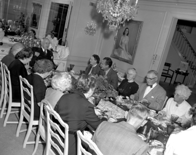 Bowie visitors here for the rodeo. A group of people seated at a table. Seated at the head of the table is Amon Carter.