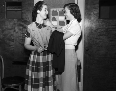 Mannie Lee Walford, 3400 W. 4th, left, is receiving assistance from Joyce Johnson, 5413 Pershing, right, in fitting her Easter dress for entrance in the Star-Telegram's $560 Home Sewing Contest.