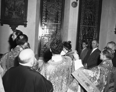 These stained glass memorial windows were dedicated at Saint Patrick's Catholic Church. Participating in the blessing service are, left to right, Reverend Carl Vogel, Monsignor Joseph G. Donohoe, Reverend Lawrence DeFalco, and Reverend Leonard Knoff.