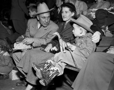 A Weatherford family, Mr. and Mrs. Robert H. R. and their son, Howard, at the city's special day at the Southwestern Exposition. Published in Fort Worth Star-Telegram morning edition February 4, 1952.