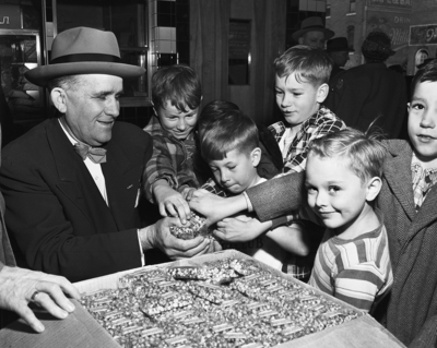 Bradley Burks, board member of the Fort Worth Boys' Club, is on the distribution end and boys' club members, left to right, James Hammond, are on the receiving end of the candy line at the Fort Worth Boys' Club's 17th birthday party at the New Isis Theater.