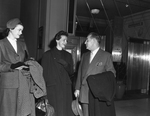 Madame Paul Auriol, center, daughter-in-law of President Vincent Auriol of France, is shown with Lawrence D. Bell, right, president of Bell Aircraft Corporation, in Hotel Texas Lobby. Madame Auriol, a noted woman flier, is Bell's guest on a tour of U. S. airplane plants. The woman at left is unidentified.