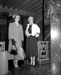 Miss Olive Filteau, left, is president of Desk and Derrick Club here, and Miss Noreen Allison, vice president. Two woman wearing dresses standing up.