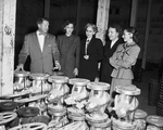 Visiting an oil well supply warehouse, Desk and Derrick members are shown pipe valves by E. V. Hubbard, left. the club members, left to right, are Miss Katy Mitchell, Mrs. Grace O'Connor, Mrs. Alma Joe Barnett, and Miss Dorothy Kassel. Four women and one man wearing suits standing up.