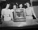 Measuring scale, a highly specialized bit of equipment, is examined in a laboratory by, left to right, Imogene Vogel, Betsy Barton, Betty Brock and Dorothy Kline. Four woman standing by a clock.