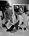 Anticipating a field trip, Desk and Derrick members shop for boots, durable skirts and shirts for West Texas jaunt. Left to right, standing are: Miss Marjorie Hipp, Mrs. Margaret Moring, and Miss Katherine Smith, with Misses Lois Wheeler, seated left, and Bebe Cooper, right. Five woman standing and sitting.