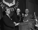 Powell C. Groner, center, of Kansas City, vice president of the U.S. Chamber of Commerce, and D. Hodson Lewis, right, of Dallas, the national chamber's Southwestern division manager, are shown at the National Affairs Area Conference in Hotel Texas. The man at left is unidentified.