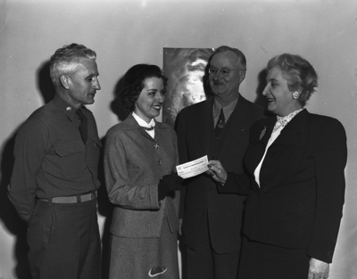 The March of Dimes fund to fight polio was enriched by $3,907.04 when the Quartermaster Depot here made its annual donation to the cause. Mrs. James Leonard, executive secretary of the Tarrant County chapter, National Foundation for Infantile Paralysis, right, is shown receiving the depot's check from Mrs. Virginia Jameson, campaign secretary at the installation. The depot's project chairman, Major H. A. Southern, is at the left. Also shown is Scott Teel, March of Dimes chairman.