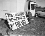 Series on Hurst, Texas. Jess Holder, real estate developer, sets up a sign on his office. The sign reads, "New subdivision residential lots for sale."