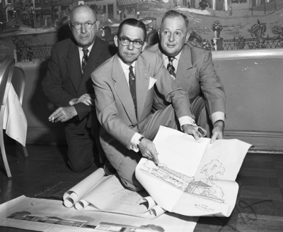 This trio is looking over some fancy new designs for the spring "Parade of Homes," sponsored by the Home Builders Association of Fort Worth. Left to right, R. A. Baxter, association president; Charles E. Armstrong, consultant-architect, and Joe Driskell, home builders state president.