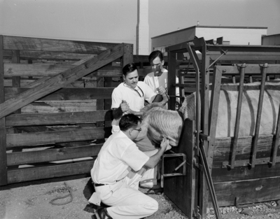 A&M veterinary students get plenty of practice working with a cattle squeeze. Here, Dr. W. W. Kirham, left, member of the hospital's large animal clinic staff, examines a Charolais cow for treatment.