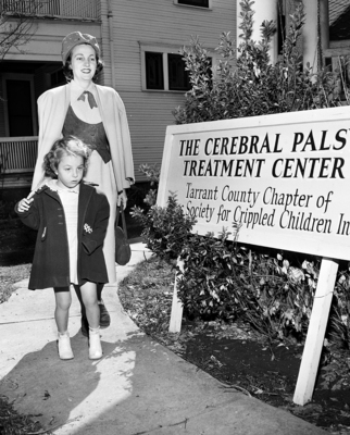 Mrs. Adelaide Griffin, wife of Mr. Harold Brooks (H. B.) Griffin, who daily drives little Linda Rae to and from the Cerebral Palsy Treatment Center, 2210 Hemphill, was one of the many volunteer workers whose efforts cut down on operating costs of the project which is financed by the annual Easter Seal sale now in progress. Mrs. Griffin, also works a half-day at the center as her Junior League civic project. Published in the morning edition, March 19, 1950.