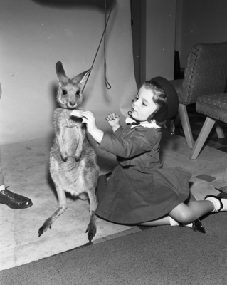 Three-year-old Christine Corrin, grand-daughter of 20th Century-Fox publicist Jimmy Gillespie, has no trouble making friends with the 10-month-old Australian kangaroo, Joey Roo, here to publicize the new movie named, of all coincidences, "Kangaroo."