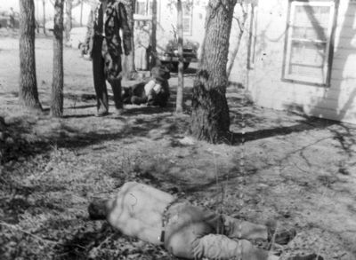 Lying wounded in foreground is a 26-year-old Dallas robbery suspect, Robert Barber, who started a wild shooting battle in Meadowbrook. Dallas Detective H. C. Holloway is lying wounded in the background, and Dallas Detective T. O. Pope is standing. Fort Worth detective Henry Cleveland was killed inside this house, and Detective A. L. Armstrong was seriously wounded. Holloway, suffering a leg wound, holds his gun on Barber, who was shot three times. Pope has just finished applying a tourniquet on Holloway's leg.