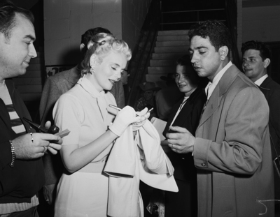 Something wrong here - Marie Wilson signs an autograph for Star-Telegram photographer Al Panzera backstage at the Stock show rodeo. After Al got through telling Marie who he was, however, she asked him to sign one for her. Standing in the background, as in his usual wont, is Irving Farman. The other gal is Shirley Gordon, Marie's press agent.
