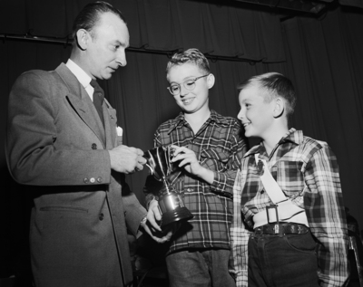 Larry Graff, left, director of the Fort Worth Safety Council, presents George C. Clarke Elementary School with a loving cup for its safety record. Receiving the cup are the directors of the school safety program, Robert Gamble, center, and Bill Parmeter, both 11.