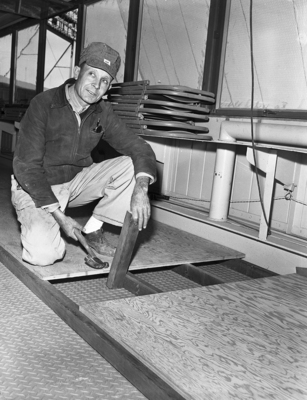 Ezra Bland, caretaker at La Grave Field, readies TV booth for baseball season.