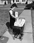 A tiny Blue Bird might have trouble with her big load of Camp Fire candy mints, now being sold over the city, but Donna Elliot found a way -- her doll buggy. Donna is the daughter of Mr. and Mrs. Fuller E. Elliott Jr. of 2808 East Lane.