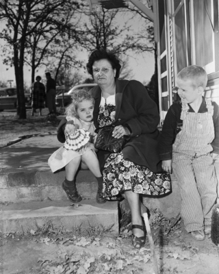 As a husband and father - a robbery suspect - lies wounded in a hospital after a gun battle here in which one detective was slain and two others wounded, the suspect's 4-year-old-daughter, Sandra Barber, sits grieving on the curb near her home. Frightened and alone, Sandra Barber fails to find comfort in sympathy offered by Mrs. J. B. Scruggs of 3101 Bright, a passerby, or in her doll. The child witnessed the shooting which killed a detective and wounded two others and her father. The boy at right is unidentified.