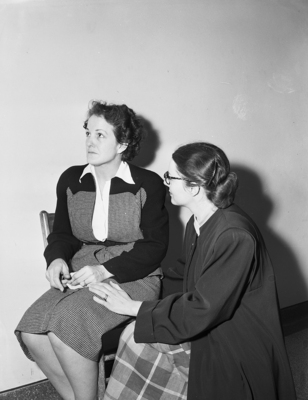Mrs. A. L. Armstrong, left, is comforted at Saint Joseph's Hospital by Mrs. Alvin Ware, her Sunday School teacher at Sagamore Hill Baptist Church. City Detective Armstrong was critically wounded in a gun battle.