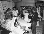 Two policemen and the man who shot them received emergency treatment at Saint Joseph's Hospital as Fort Worth city policemen stood by. On the emergency tables, left to right, are Dallas Homicide Detective H. C. Holloway, Fort Worth City Detective A. L. Armstrong and the man who wounded them, Robert Barber. In the foreground is Fort Worth Motorcycle Sergeant Howard Gurley.