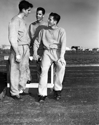 Image shows three freshmen trackmen from Texas Christian University (TCU), James wood, Jimmy Roddy and Jimmy Breeding. They are shown to be relaxing on a hurdle. Published in the Fort Worth Star-Telegram morning edition, February 8, 1952.