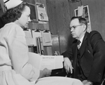 Miss Maxine Graham, nurse, is shown interviewing Lee Bolles, variety store owner, on making a survey of his employees.