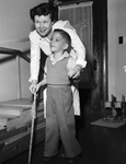 Miss Peggy Dyer, physical therapist and little Eugene Colvin, who is now able to walk with the aid of his little cane.