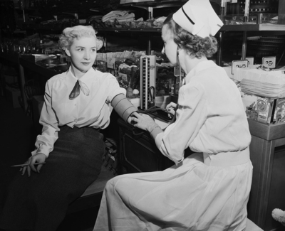 Miss Maxine Graham, nurse, takes blood pressure of Mrs. Ann Jones, left.