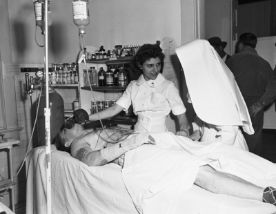 Robert Barber, 26, charged with murder in the death of City Detective Henry E. Cleveland and assault to murder for wounding two other detectives, receives emergency treatment for his wounds at Saint Joseph's Hospital.