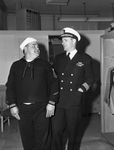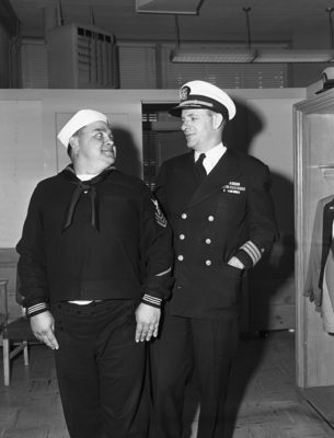 Engineer 1/c Thelma Causey, left, takes a deep breath and prepares to march forth bravely to donate blood at the North Texas Defense Blood Center. Giving Causey moral support is Commander William T. Samuels of the Naval Reserve Training Center, 2222 Worth.