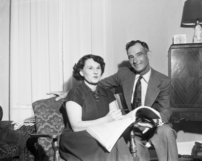 Mrs. Flora Varney Noble of 1516 Gould shows her half-brother, Elton H. Varney of 2814 Race, how she traced him. The brother and sister had never met until Mrs. Noble found Varney's name in a Fort Worth telephone book.