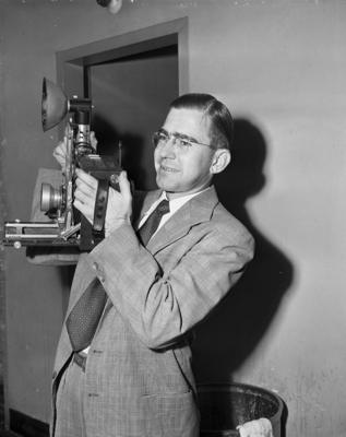 Bob Bain, camera in hand, is Dub McPhail's newest photographer. Robert reached the Star-Telegram darkroom from the San Antonio Express, just in time to get a taste of the 1952 Southwestern Exposition and Fat Stock Show. He's single. Published in Fort Worth Star-Telegram evening edition February 08, 1952.