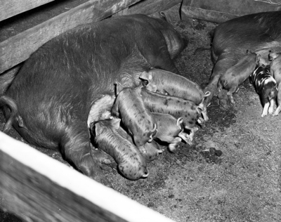 Baby pigs having lunch at the Moore farm near Lorenzo.