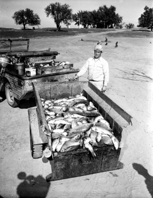 Here is Roy Green with a consignment of the 1,400 pounds of carp and buffalo trapped one day recently. The boats came in each day. The fish are loaded into this truck and trailer and go to the cleaning shed.