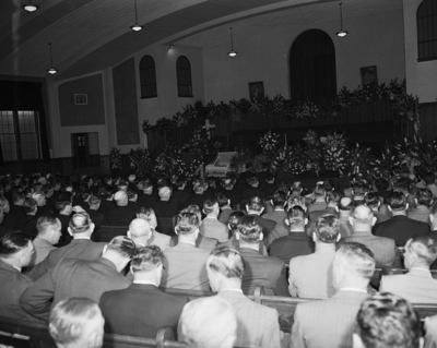 Pews of the Rosen Heights Baptist Church were filled with officers and friends of Henry Cleveland at his funeral. They face the flower-bedecked casket in front.