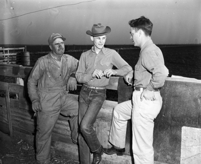 From the left are T. A. Shipp, his son Wayne, and Tommy Hewlett, assistant Hale County agent who supervises Wayne's 4-H feeding projects. Published in Fort Worth Star-Telegram evening edition February 9, 1952.