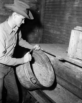 Wayne distributes some of the feed that he has mixed for steers that were on pasture for six months before going on feed. Published in Fort Worth Star-Telegram evening edition February 9, 1952.